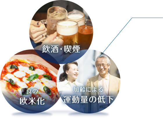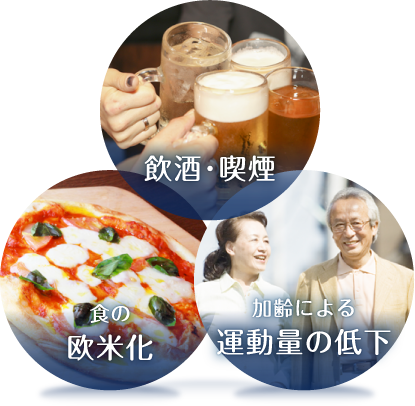 大腸がんのリスク因子として、ほとんどを占めている原因は過剰な飲酒と喫煙です。食の欧米化が進み、日本では生活習慣病もかなり進行しております。肉や脂肪の摂取が多く食物繊維の摂取が少ない状態を続けることが、大腸がんを引き起こす原因のひとつとなります。