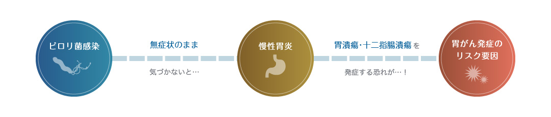 ピロリ菌は必ず感染者全員がこのように胃がん発症につながることはありません。しかし、慢性胃炎の自覚症状はほとんど感じられない為、無症状のまま経過を過ごした結果、胃がんを発病してしまうこともあるのがこの菌の恐ろしいところです。